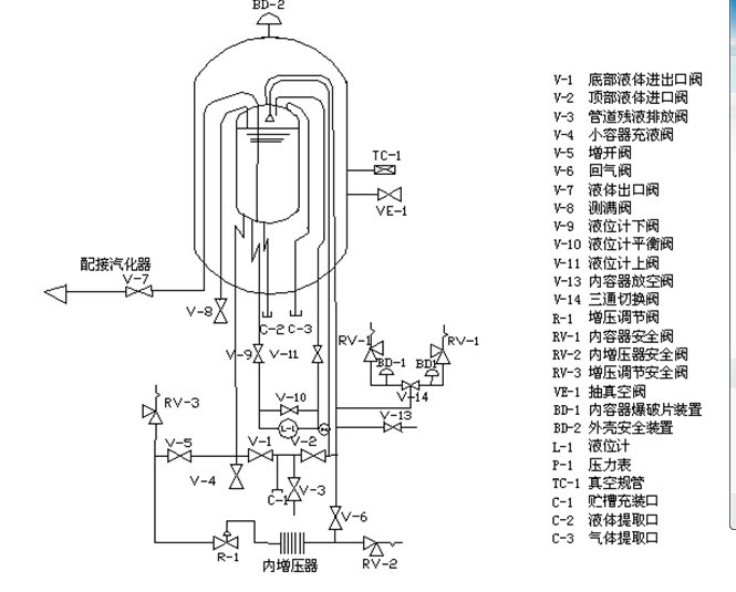3.2.4檢查貯槽壓力是否正常,當(dāng)貯槽壓力接近或等于最高工作壓力時(shí),須打開內(nèi)筒放空閥V-13泄壓。